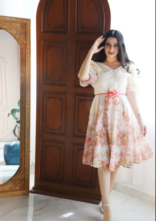 - التصميم مميز: فستان مورد قصير يصل إلى بعد الركبة بتصميم جدًا مميز، فالجزء السفلي منه واسع يتدفق مع الحركة كما أنه مشجر بورود متداخلة وممزوجة معًا ليعطيكي مظهر أنثوي رقيق.